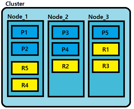 그림은 3개의 노드로 구성된 Cluster에서 5개의 Shard를 가진 Index를 표현한 것입니다.
