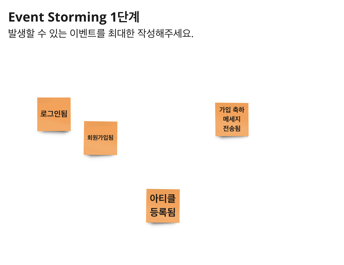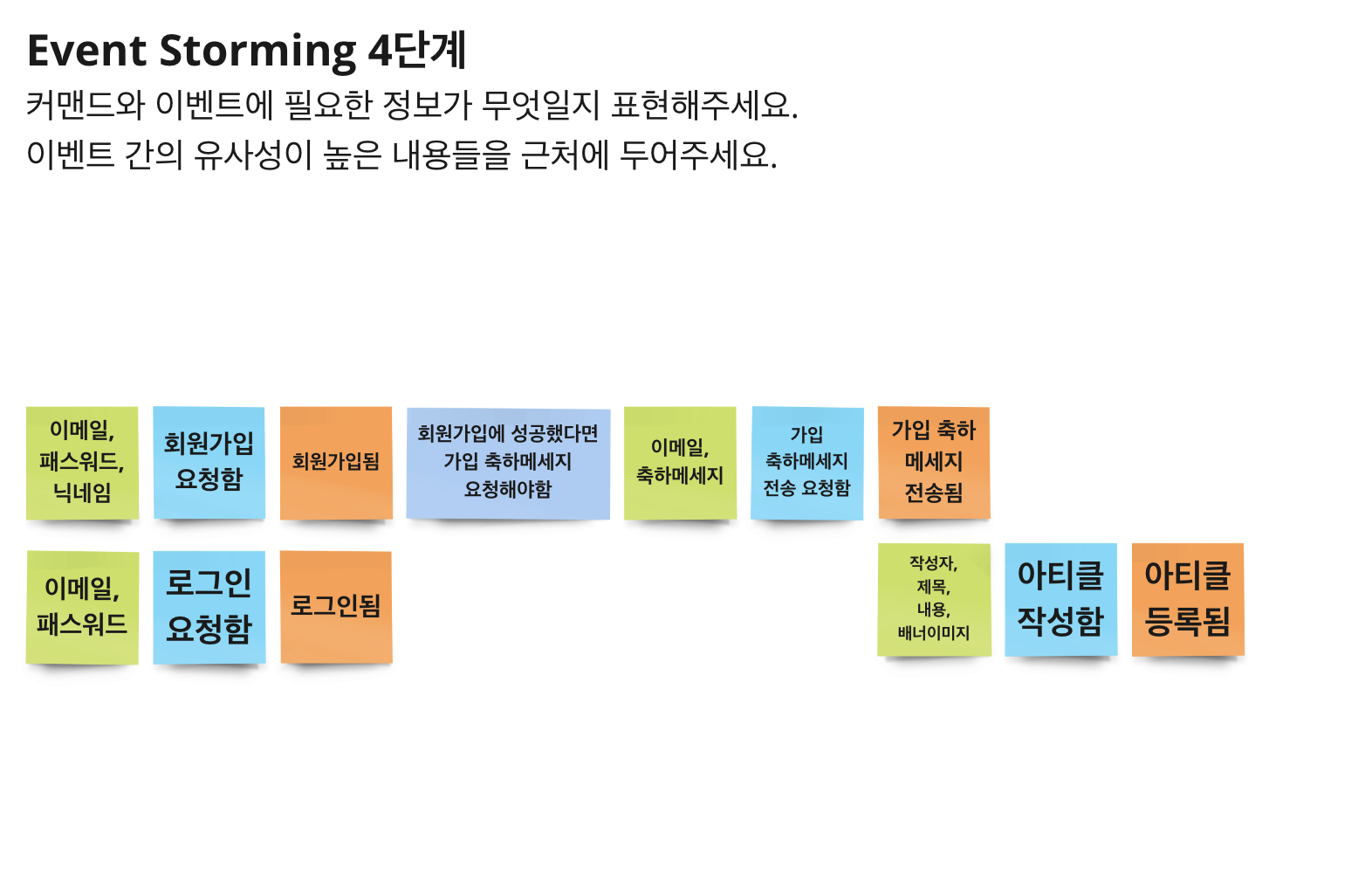 | DomainEvent | 주황 | 시스템 내에서 발생한 상태 변화를 표현합니다. 해당 이벤트에 관심을 갖을 이벤트가 있을지 고민해주세요. | 회원가입됨. 축하 메세지 전송됨. |