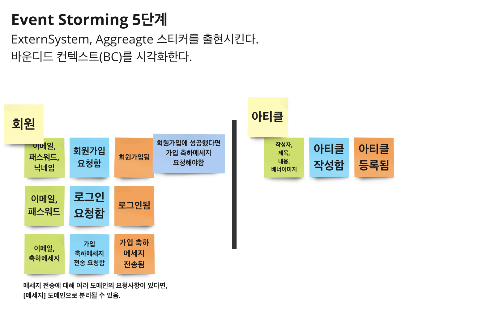| ExternSystem | 보라 | 모델링하고 있는 도메인의 외부에 있는 시스템을 의미합니다. | 회원 기준 → 메세지 |