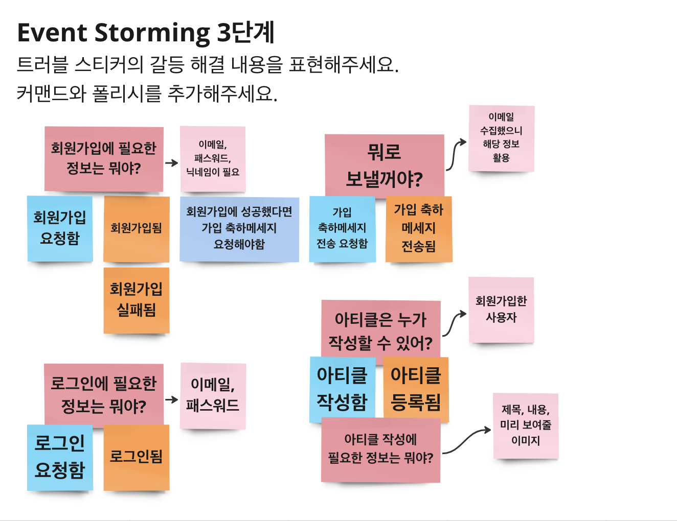 | Policy | 파랑 | 커맨드를 호출하는 특정 조건 및 규칙을 표현합니다. 즉, 이벤트를 일으키는데 필요한 조건 및 규칙을 의미합니다. | 회원가입이 되었다면 가입 축하 메세지 전송을 요청합니다. |