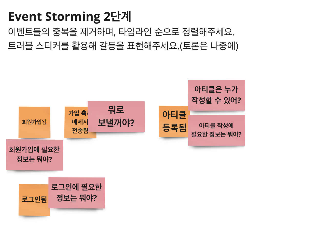 EventStorming은 도구일 뿐이니, 예시로 알려드린 스티커의 의미를 너무 깊게 고민하지 말고 시도해 주세요.