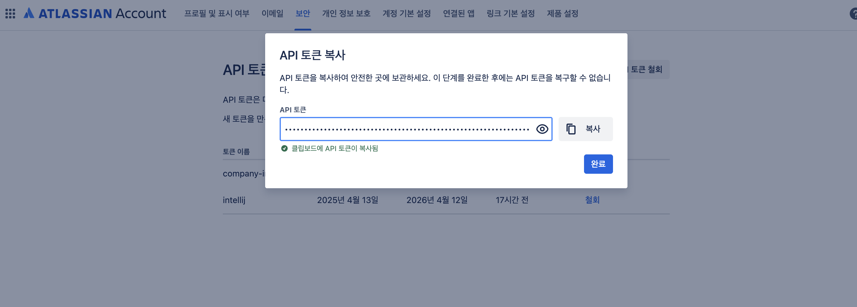 API Token 기반 관리를 위해 아래 링크에서 Jira 계정으로 로그인 후 발급.